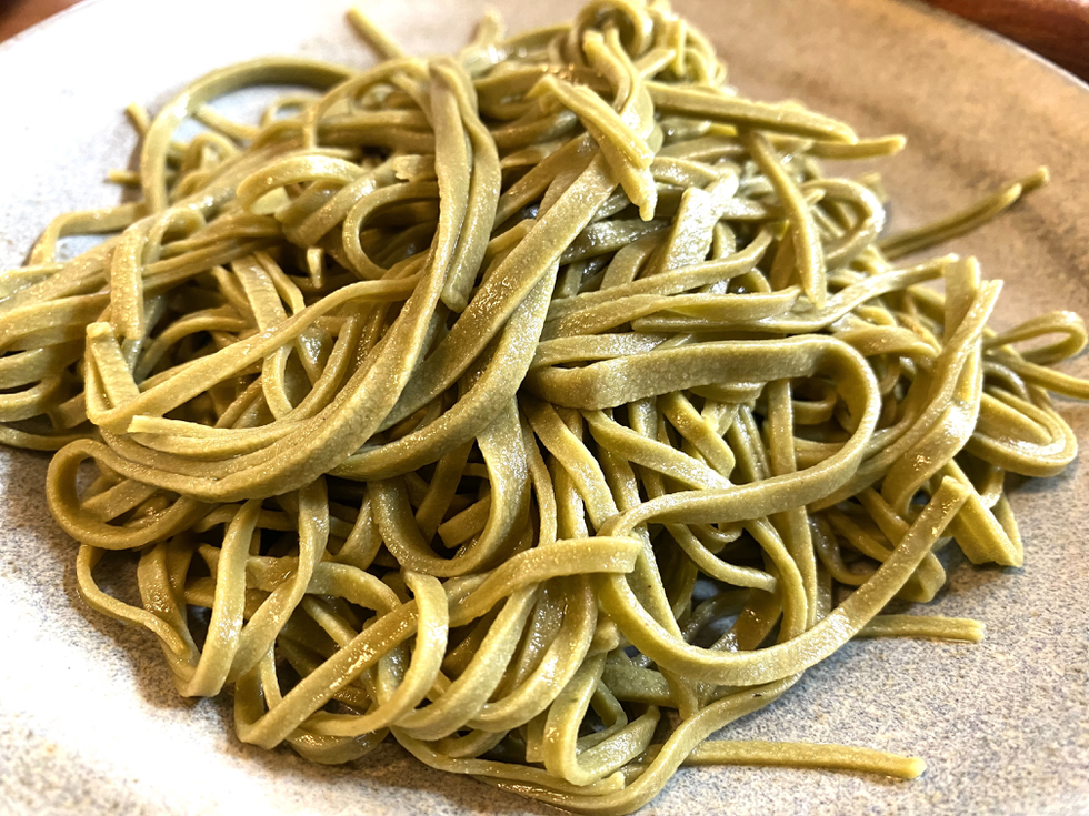 Enjoying homemade tea soba noodles